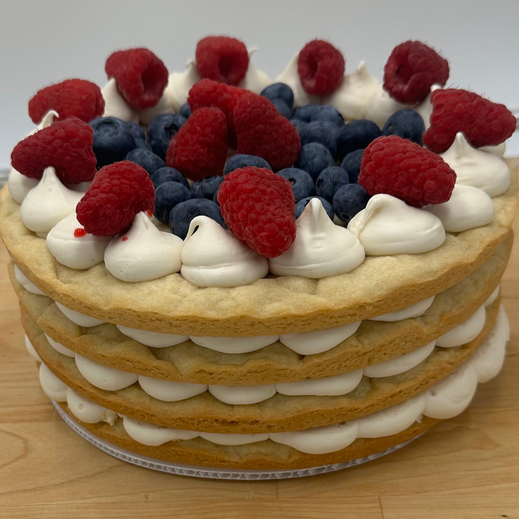 This is a 9" 4 tiered sugar cookie cake topped with marshmallow buttercream and your choice of fruit.