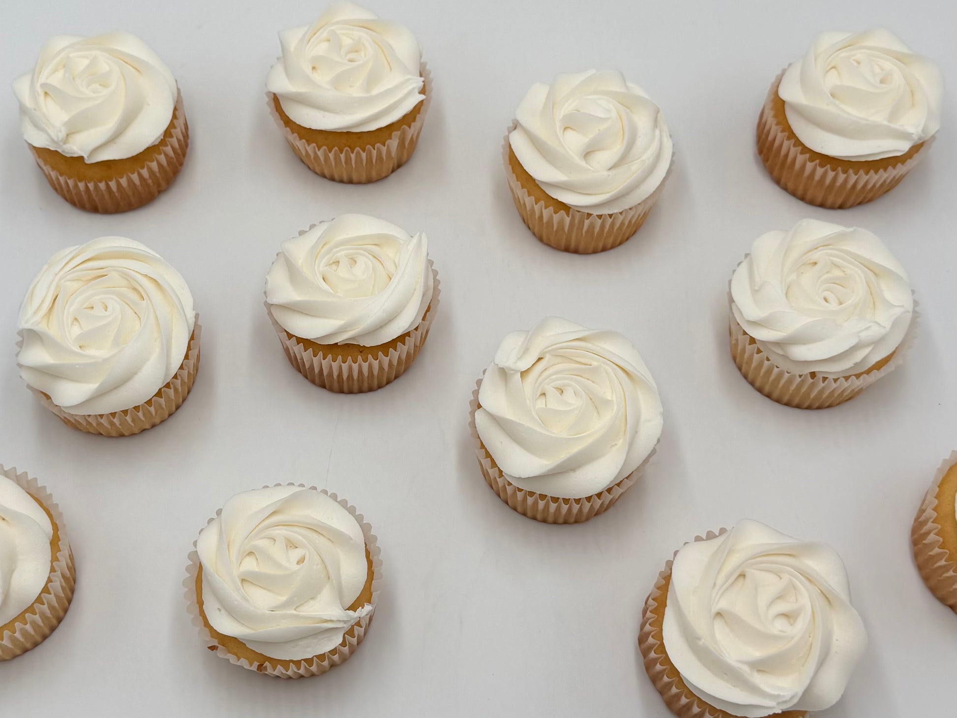 A white cupcake with marshmallow buttercream frosting. Sold by the dozen.